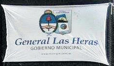 The flag of General La Heras is white with the arms of Buenos Aires Province and the municipality above the name.