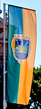 The flag is a vertical bicolor of green and yellow with the city coat of arms on it.