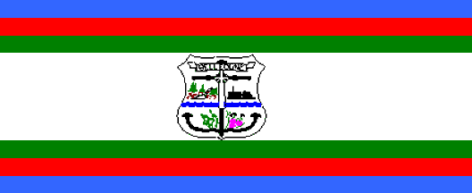 The flag of the Village of Belledune, New Brunswick, consists of 7 horizontal stripes blue-red-green-white-green-red-blue, where the red stripe is much wider then the others. In the center of the white stripe the village shield is positioned. Image of the flag thanks to David Hughes.