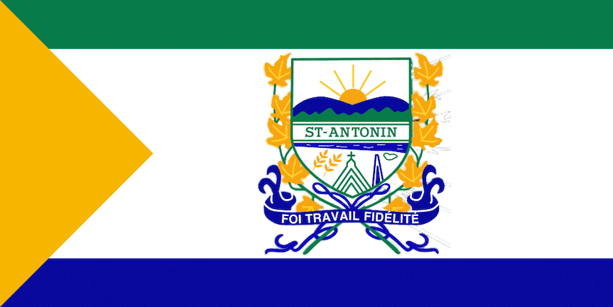 A flag for the Town of Saint-Antonin in MRC Riviere-du-Loup, Quebec, dated July 2011, had an orange triangle at the hoist and continuing with three horizontal bands of green, white, and blue, where the white is much wider than the other two bands. In the white band, a little towards the fly, is positioned the town coat of arms: