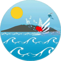 The circular shield is cyan (light blue), sky over sea, the latter with white