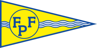 The pennant is yellow fimbriated light blue. Shifted to hoist on a yellow disc fimbriated light blue is a blue inscription "FFP" ordered 2:1.