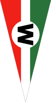 The vertical pennant is divided vertically of green-white-red with a white disc shifted to top with a black initial "W".