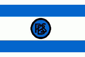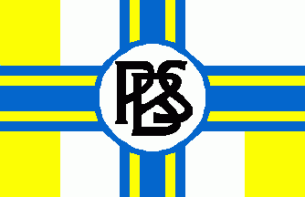 The white flag was parted by a blue centred cross cotized yellow-blue. Three quarters are parted per pale of yellow and white (yellow parts outward). On centre was the logo of the club, intertwined stylised black initials "PBS" on a white disc fimbriated black. The flag probably belonged to the rowing section of males, as the ladies had a flag of their own the same year (see image below)