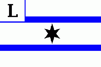 The 1st flag (see left image above) displays a black 6-point star between two horizontal blue stripes. In canton is a black initial "L" separated by thin blue lines.