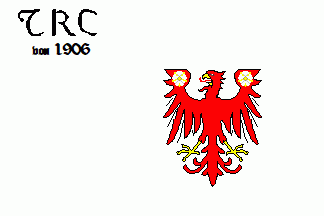 The current flag is white with the city arms shifted to fly and bottom and black stylised inscription on canton "TRC"(1st line) and "1906"(2nd line, smaller).