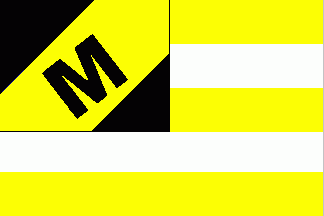 The black canton was parted by a broad yellow bend sinister charged with black initial "M" in bend.