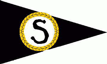 The flag was white parted by a black equilateral triangle pointing to fly. Over all in a yellow wreath was a black initial "S".