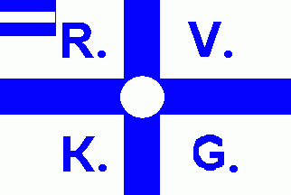 The origin is however superimposed by a white canton with two dark-blue crossed oars and dark-blue capital letters as follows:
