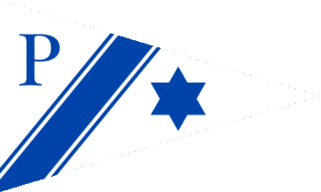 It was a white triangular pennant divided by a blue cotized stripe per bend sinister. There was a blue 6-point star on lower fly and a blue initial "P" on upper hoist.