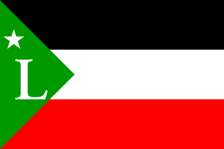 It is a horizontal tricolour of black over white over red with a green hoist triangle bearing a white capital serifed "L" and a small five-pointed white star at the hoist corner. The "L" is vertically aligned on the lower horizontal dividing line, its height is slightly smaller than the height of the white stripe, and it is horizontally aligned to the central tip of the triangle (fly side); the star is vertically aligned on the upper horizontal dividing line.