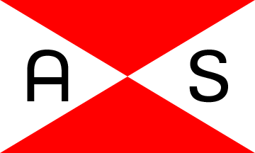 Source shows a flag divided saltirewise red over white flag with black intials "A"