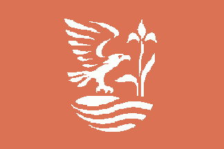 In a red shield are white charges. On the dexter side is an eagle with spread wings facing the other side where a flower is depicted. The eagle stands upon a stone above from three waves.