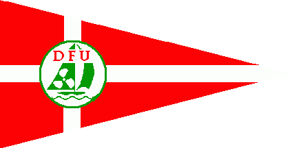 The pennant is red and parted by an off-centred white cross, you can say a pennant version of the Dannebrog, on the point of intersection of the cross bars is the logo, a white disc, charged with a green sailing boat over green waves, the bigger sale charged with a white water propeller, over all at the top is a red inscription "DFU".
