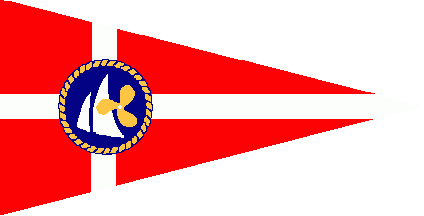 The pennant, maybe the new one is red and parted by an off-centred white cross, you can say a pennant version of the Dannebrog, on the point of intersection of the cross bars is the logo, a white disc, charged with a green sailing boat over green waves, the bigger sale charged with a white water propeller,