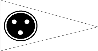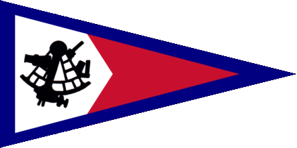 The pennant is parted per chevron pointing flyward, at hoist white with a black sextant, at fly red (see left image above), a different version has a blue fimbriation at top- and bottom edge (see right image above).