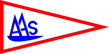 The name literally means "Pleasure Boat Guild" horizontally divided of white and red. At hoist is a blue anchor in bend above and a white inscription "ASK" below..The pennant is blue with connected white initials "AL", either thin (see left image above) or bold (see right image above) shifted to hoist. Amtoft is a hamlet in the Arup Parish near Thisted.