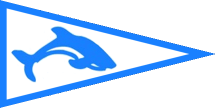 The club is located at the eastern edge oft he centre of Aarhus. The pennant is blue fimbriated white on either edge (see left image above) or only at top- and bottom edge (see right image above). On hoist is a white trident pointing downwards onto a white wavy line. The trident might also be interopreted as a miniscle "m".