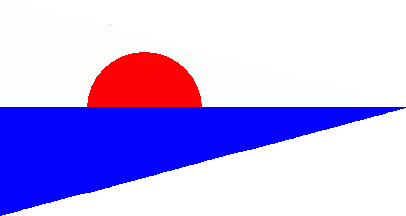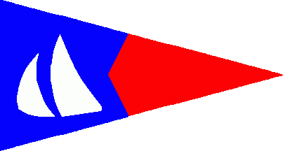 The pennant is parted per chevron pointing to hoist of blue and red. On the blue part at hoist are two white sails.