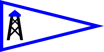 The pennant is white fimbriated blue. Shifted to hoist is a black tower with blue roof, probably a representation of the local pilot tower (lodstårn), see this webpage. Dragør is located on the southern tip of Amager Island.