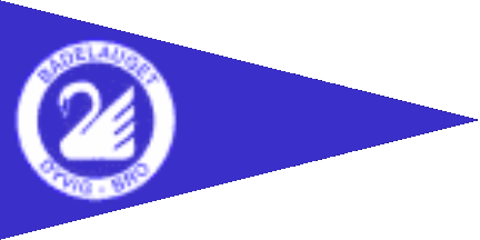 The pennant is blue. Shifted to hoist is a white swimming swan, surrounded by a white annulet with blue inscription "Bådelauget Dyvig Bro".
