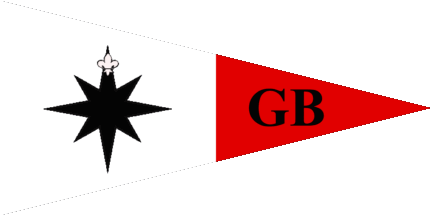 The club is based in Nykøbing / Falster. The pennant is white with a red disc with eight spikes, those pointing to hoist and fly are longer. In canton is a blue inscription "MG" (see left image above) or "BG" (see right image above). The name giving sound divides Falster from Lolland.