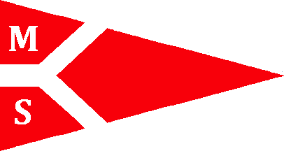 The pennant is red parted by a white chevron pointing to hoist and in hoist parted by a horizontal white line, in upper hoist is a white serifed initial "M", and in lower hoist a white serifed initial "S".
