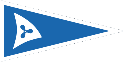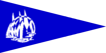 The pennant is blue. At hoist are various white sails over white waves, partially surrounded by a white circle.