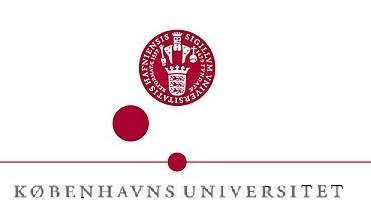 It is a white flag with logo, the university seal in red with white inscription and image plus two red dots, the smaller one tierced by a red horizontal line. At bootm the name in Danish in dark grey serifed initials.