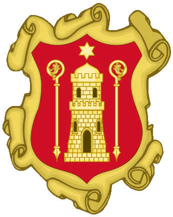 Description: Gules, a gold tower, with a keep and roof, with gules windows and sable masonry, surmounted by a six-pointed silver star, and flanked by two gold pastoral staffs, placed vertically.