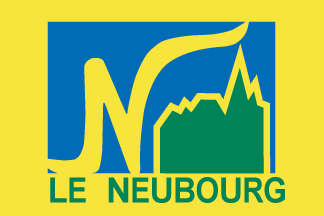 Le Neubourg is twinned with the English town of Gillingham (Dorset). In July 2006, the twinning committee met in Le Neubourg. Photos of the event (no longer online) show members of the commitee, the Queen of Neubourg, and the flag of Neubourg. The flag is similar to the municipal logotype, with the elements originally in white on the logotype in yellow on the flag. The building shown on the flag is the massive St. Paul church of Le Neubourg, built at the end of the 15th century, in late Gothical style. The two towers surmounting the gate and the vaults of the church were never finished. Burned by the Duke of Parma on 14 March 1592, the church was restored in 1610. The steeple an the campanile were destroyed in 1940.