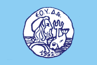 The flags of the Hellenic Federation of Underwater Activities and Sports Fishing are light blue with the federation's emblem in the center.