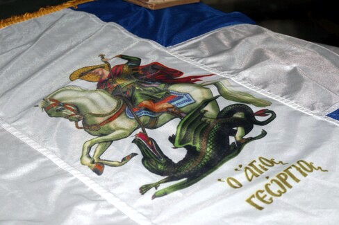 that shows also a St. George's flag on the Jeep's bonnet (inscription: Ho Hagios