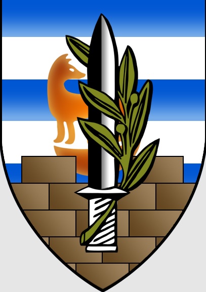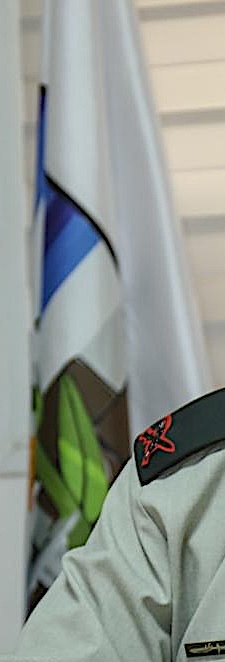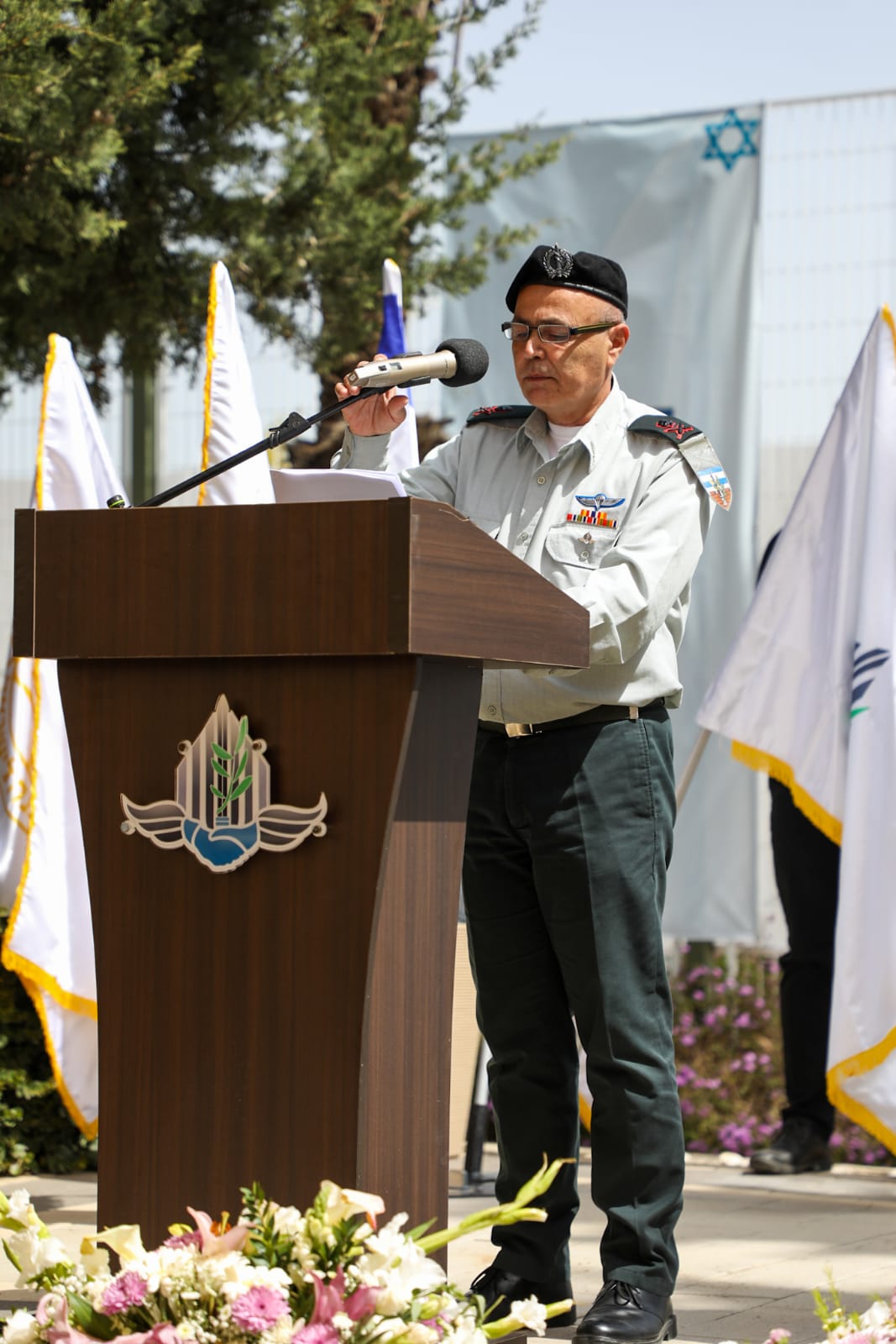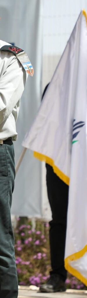 The flag is a horizontal white background with the logo in the middle. It seems that somewhere during and/or after 2021 they changed their logo to the current version, having the same pattern as the Ministry of Defence pattern logo (a menorah-like wall made up of sword blades superimposed with an olive branch with two shaking hands, the old logo being a desert fox behind the sword and the olive branch superimposed over a wall and on the background the Israeli pattern flag).