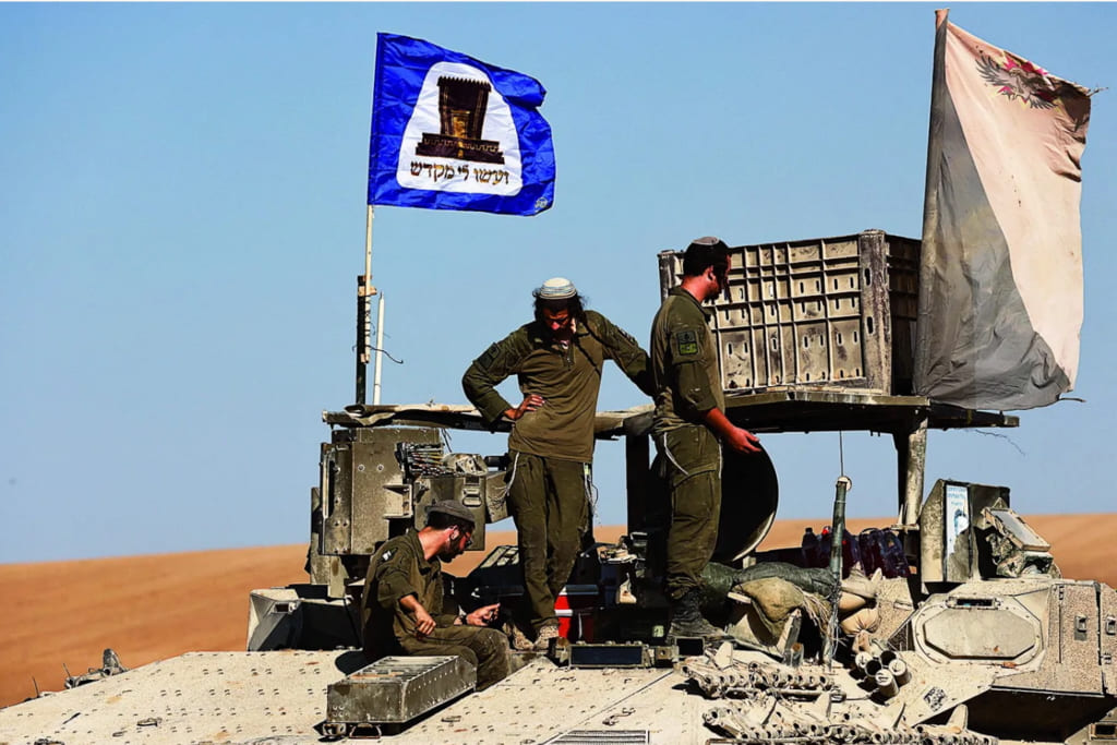 • Here the same flag in square format (Photo by Amir Cohen/Reuters showing Israeli soldiers on the Gaza border, September 2025. Located by William Garrison on haaretz.com)