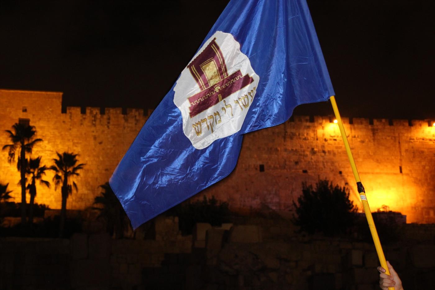 The predominant flag version shows the ancient or prophesied Third Temple in Jerusalem, with the writing below: "And they made me a temple" (ועשו לי מקדש, wasu li mikdash).