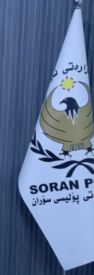 The Soran Police flag is white and has the regional government logo centered upon it. Underneath the logo is SORAN POLICE; in English and then in Kurdish. These elements are diagonally placed to appear upright on indoor flag stands.