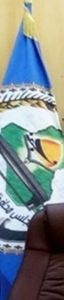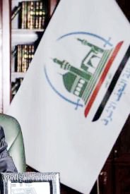 The flag depicts the logo with its name underneath it in stylized Arabic. The
