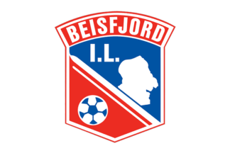 The flags of Beisfjord IL (Beisfjord Idrettslag) from Beisfjord in Narvik Municipalityare red or white with the badge centered.