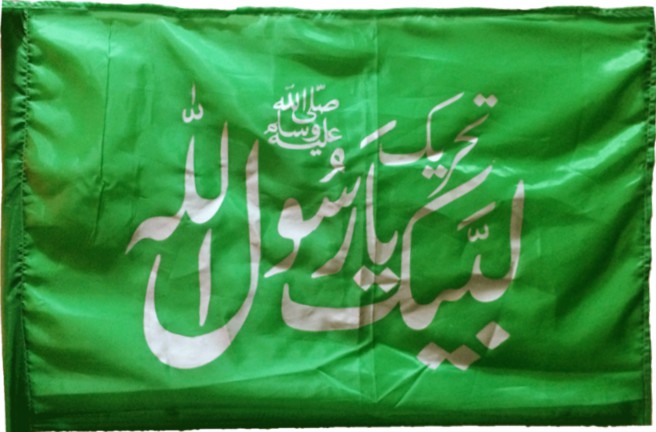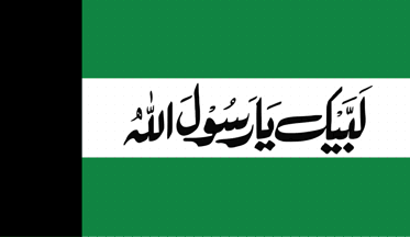 Flag variations of the "Tehreek-e Labbaik Pakistan" (TLP) feature the Urdu phrase (when read right-to-left): "Labbaik Ya Rasool Allah", which is the organization's motto. Sometimes, as a party-affiliation image, a yellow construction crane-truck appears on some of its political posters and flags. "Labbaik ya Rasool/Rasul Allah" = "Here I am, Oh Messenger of Allah". The "Messenger of Allah" refers to the Muslim prophet Muhammad. "Labbaik" = "Here I am" or "(I am) At your service."