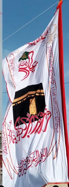 This flag can be readily identified as a Shia-Muslim flag as along both the left and right sides of it are depictions of the double-pronged Zulfiqar sword. The Shia believe that this sword was used by the Muslim prophet Mohammed, who allegedly gave it to his cousin and son-in-law Ali ibn Abi Talib. Shiites ("Followers of Ali") maintain that this sword's transfer meant that Muhammed was bequeathing the leadership of the Muslim "ummah" ("community") to Ali and his heirs. Sunni Muslims accept Ali as their fourth Rashidun caliph (political leader), while the Shia recognize Ali as being their first Imam leader. In the middle of this flag there is an image of the Muslim's holiest shrine: the black-clothed Kaaba in Mecca, KSA. Above it is the word Urdu word for "Ali". According to Islamic tradition, both Shia and Sunni believe that Imam Ali was born inside the Kaaba c. 600 CE. Following Ali's assassination in early 661 CE, he was succeeded by Muawiya I, who was then succeeded by his son Yazid. However, one of Muhammad's grandsons, Imam Husayn/Hussain, thought that he should succeed Muawiya. Husayn led a small militia of supporters towards Damascus to overthrow Yazid, however Husayn was killed at the Battle of Karbala in Oct. 680 CE, which led to a split of the Muslim community between the Shia (Husayn) v. Sunni. Disgruntled Shia therefore display this flag that proclaims their still hoped-for control of the Muslim ummah. This narrow but long flag was displayed in Pakistan, where about only 15% of the population are Shiites.