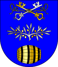 Shield Azure an olive branch Argent fructed Or, on chief a pair of keys in saltire tied Argent, one key Or and one key Argent, on base a barrel Or with hoops Sable.