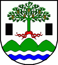 Shield Argent, issuant from base wavy of Argent and Azure a triplemount Vert, on chief a pine tree Vert fructed Or and eradicated Gules, flanked by two billets Sable.