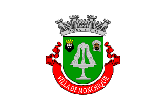Mural crown Argent with four visible towers (town rank)and white scroll reading in black upper case letters "VILA DE MONCHIQUE".