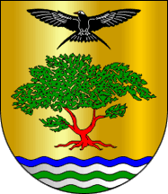Shield Or with base wavy of Azure, Argent and Vert (5 waves), an eradicated cedar Gules leafed Vert, in chief a roseate tern (Latin: Sterna dougallii, a kind of terns) volant Sable, garnished Argent and beaked Gules.