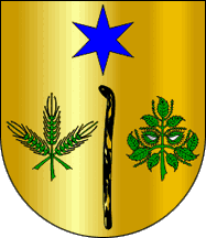The star is depicted as six-pointed but the blazon doesn´t specify the number of points. It is an attribute of Our Lady of Protection, the local patron saint. The staff is blazoned simply as Sable, but it is depicted as spotted Or.