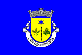 Shield Or a staff Sable in pale, flanked at dexter by three rye ears Vert joined at their stems and at sinister by a chestnut twig Vert with its burrs open Argent, in chief a 6-point estoile Azure. Mural crown Argent with three visible towers (village rank) and white scroll reading in black upper case serifed letters "LAPA DOS DINHEIROS".