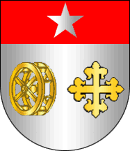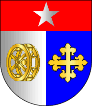 Shield parted per fess of Argent charged with watermill wheel Or (!) and Azure charged with a cross fleury Or (see left image above) or Argent charged with a cross fleury Or (see right image above), chief Gules charged with a 5-point estoile Argent. Mural crown Argent with four visible towers (town rank) and white scroll reading in black upper case serifed letters "".