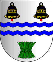 Shield Argent a fess wavy Azure charged with a barrulet wavy Argent, in chief two bells Sable with bobbins Gules garnished Or, in base a garb of straw Vert.