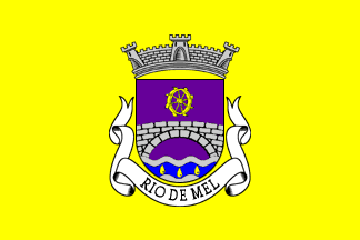Shield Purple a hump bridge Argent masoned Sable issuant from flanches and from base wavy Argent, bearing a barrulet wavy Azure, charged with three drops Or, in chief a watermill wheel Or. Mural crown Argent with three visible towers (village rank) and white scroll reading in black upper case serifed letters "RIO DE MEL".